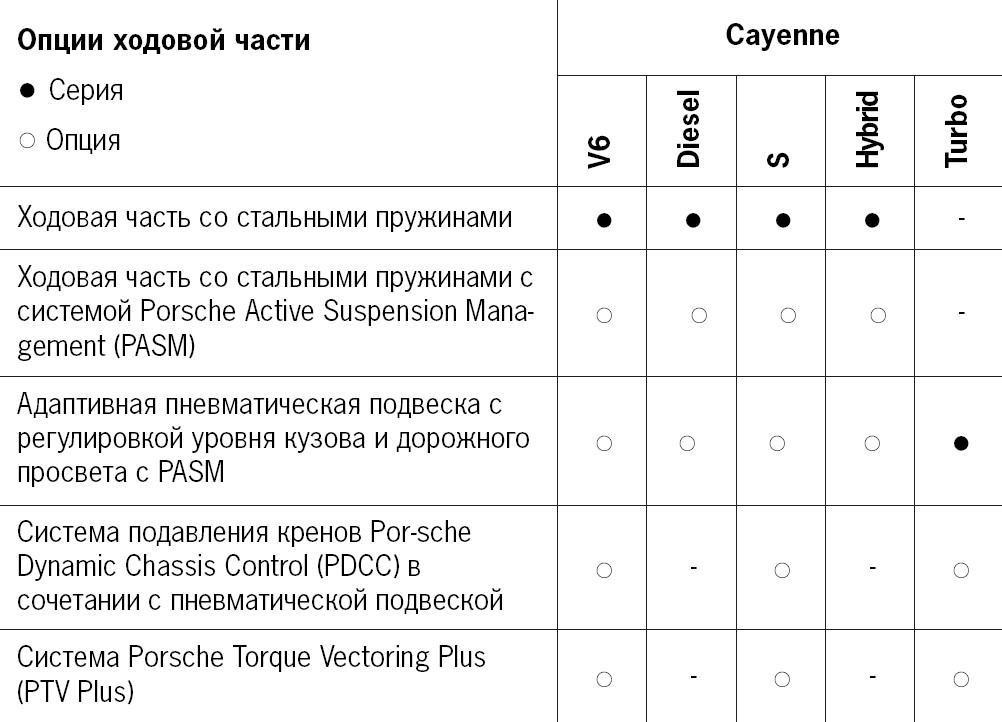 Новые модели Cayenne, Cayenne Diesel, Cayenne S и Cayenne Hybrid серийно оснащаются пружинной подвеской. В зависимости от варианта двигателя и коробки передач в моделях Cayenne и Cayenne S с механической коробкой передач или коробкой передач Tiptronic жесткость пружин варьируется.