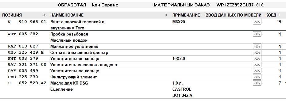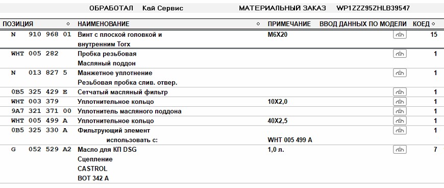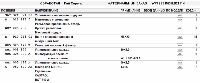 Подскажите пожалуйста что нужно заказать для замены масла в коробке пробег 60000 км на Масаn VIN WP1ZZZ95ZJLB12092