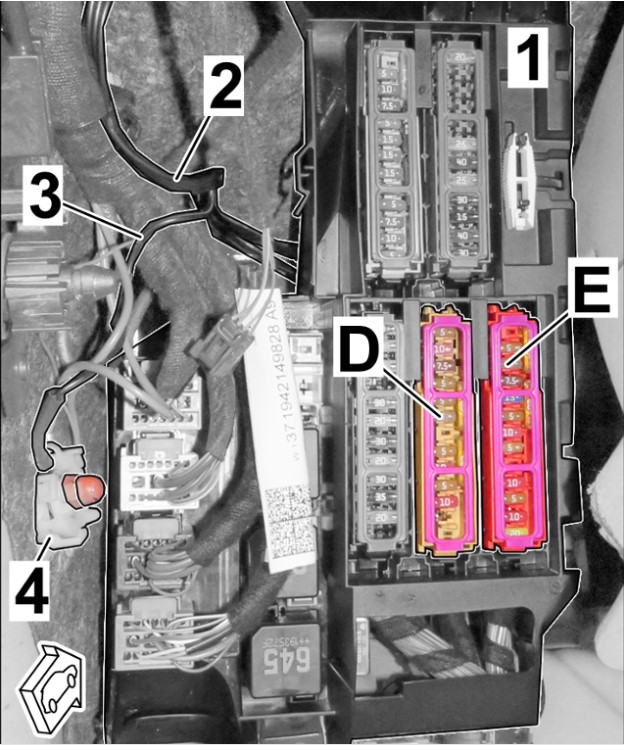 Клемма 30 = красный; 0,5² Гнездовой контакт 2,8 x диаметр 1,0 мм² (Junior-Power-Timer N.906.844.01) в гнездо 3, предохранители ряда E (E3)