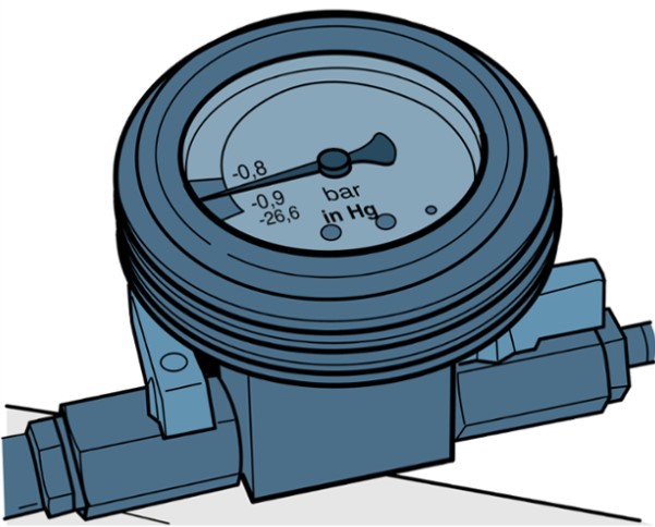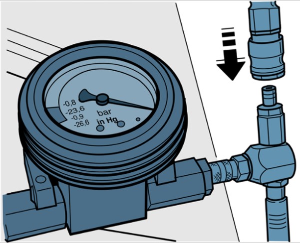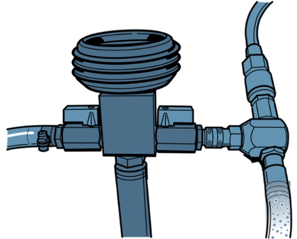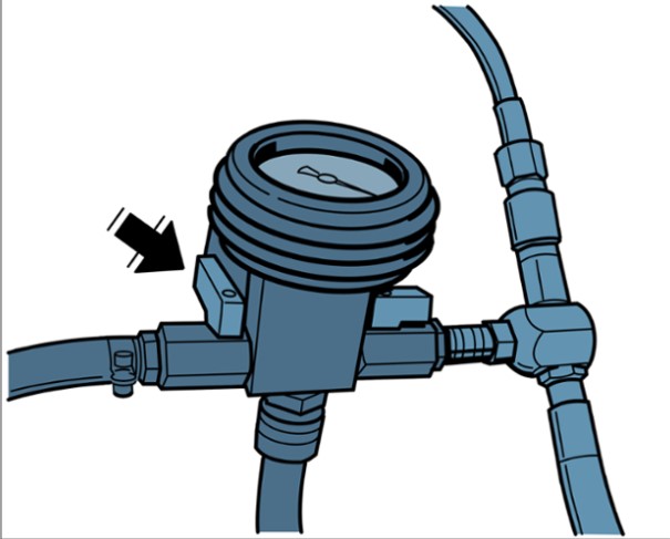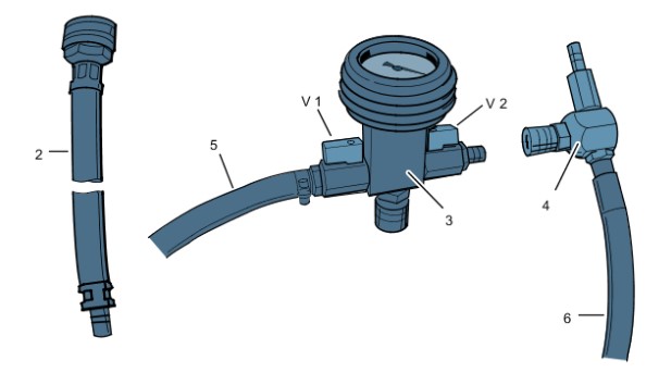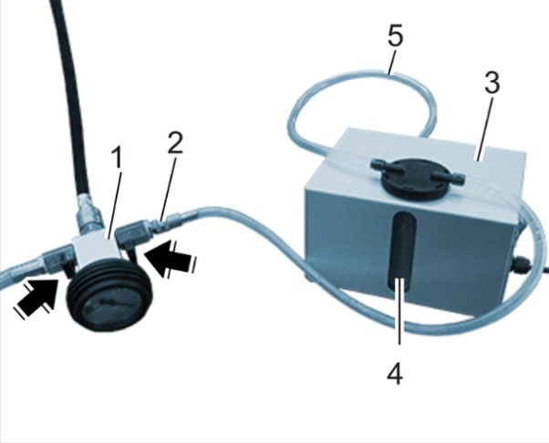 11 Подсоединить заправочный шланг -5- вакуумметра к штуцеру канистры. Направить отводящий трубопровод -6- от сопла Вентури во вторую емкость (ведро).