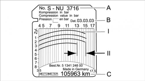 -I- Давление компрессии проверенного цилиндра. Давление измеряется в бар. 1 бар = 14.5 psi. Существуют различные диаграммные листы. Используются листы для бензиновых двигателей.