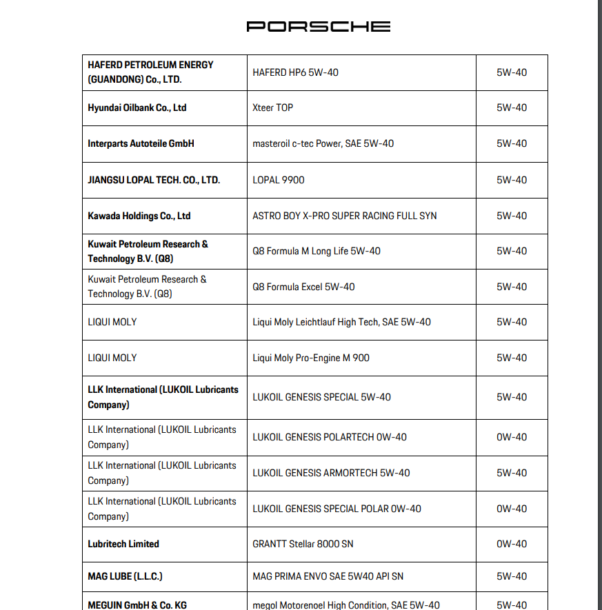 Вот сейчас я зашел на официальный сайт porsche.com и в списке рекомендованных масел А40 для 955 turbo 2006 есть только пару артикулов Liqui Moly и то они 5W40. Т.е. политика производителя пересмотрена насчёт 0W40?