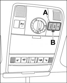2. Нажать обе внешние кнопки -A- I и III в потолочной консоли. Снова отпустить эти кнопки, когда светодиод -B- примерно через 20 с начнет мигать.