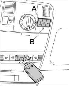 Нажать и держать нажатой запрограммированную кнопку -A- на потолочной консоли. У системы со сменным кодом светодиод -B- мигает короткое время быстро и затем горит постоянно в течение двух секунд. Эта картина повторяется до 20 секунд.
