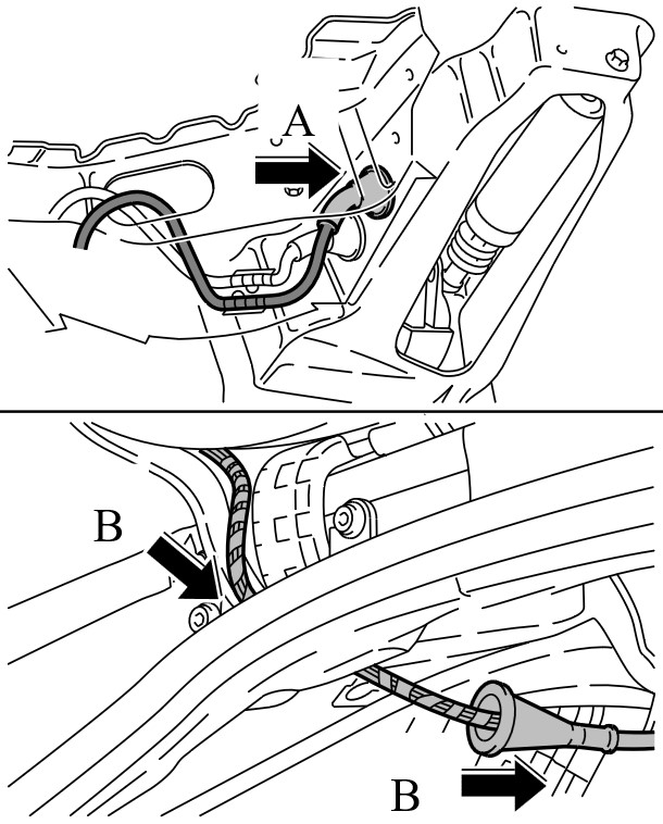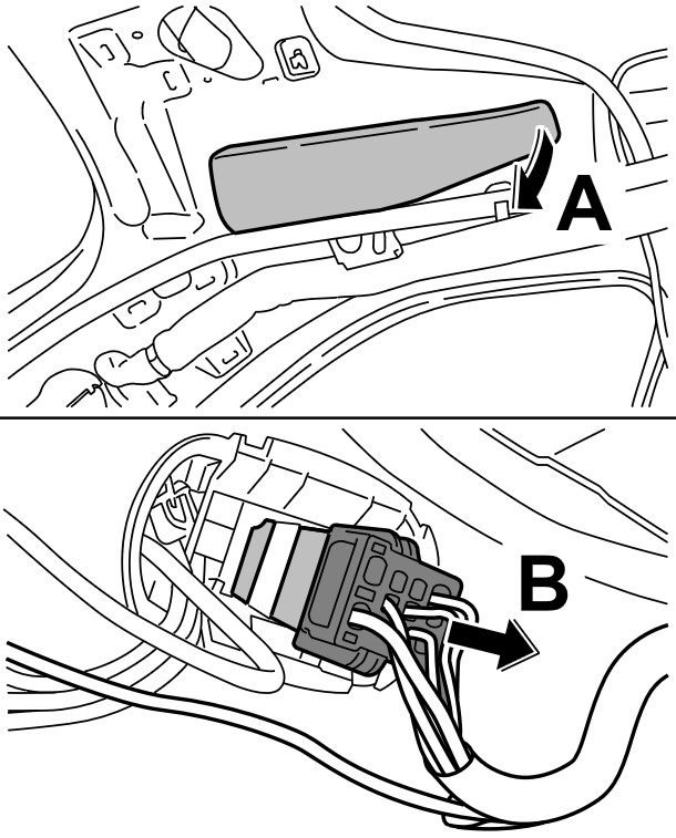 8. Извлечь жгут проводов, идущий в салон -стрелки B- . При этом из-за недостатка свободного места провести разъемы по отдельности мимо шарнира задней крышки.