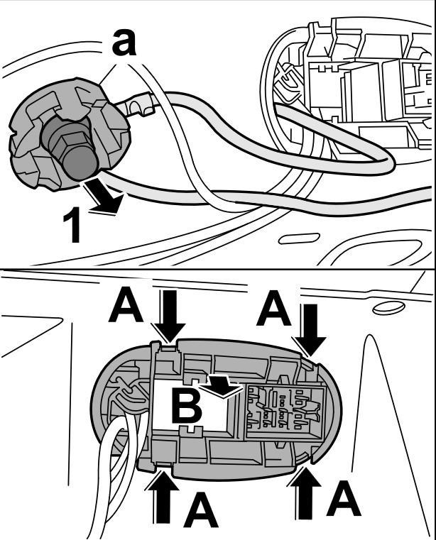 4. Разблокировать кронштейн штепсельного гнезда -стрелки A- и извлечь его из отверстия -стрелка B- .