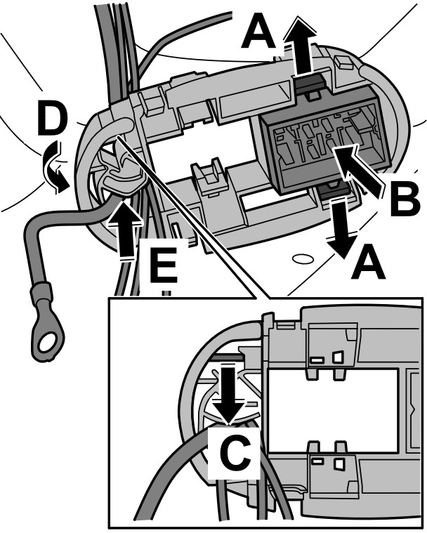 6. Разблокировать кронштейн -стрелка C- , откинуть его вверх -стрелка D- и извлечь провод массы -стрелки E-