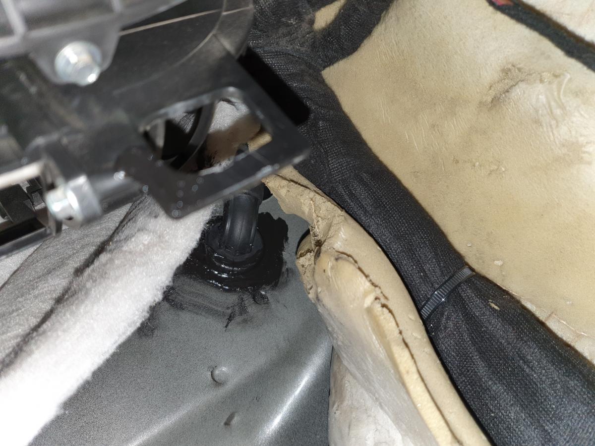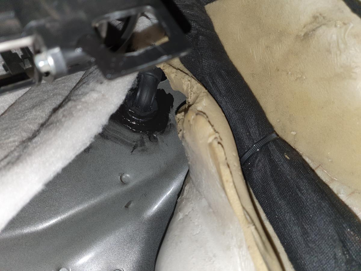 Уже сдался. И тут совершенно случайно обратил внимание на мокрую шумоизоляцию поверх правой передней стойки, 10 см от пола. Скинул клипсу, обнаружил 3 отверстия внутрь — 2 по 40 мм, одно под клипсу. Засунув палец в большую дырку, понял, что залез в аквариум. Вода там уверенно плескалась. То есть собирающаяся там неведомым образом вода (либо из-за забитого неведомого дренажа, либо вообще попадающая туда случайно) вследствие кренов авто при движении или из-за переполнения просто переливалась в салон.