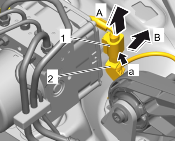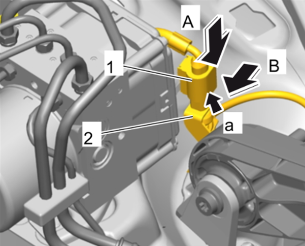 7 Подсоединить электрическое штекерное соединение -1- амортизационной стойки -A- и заблокировать его -a-.