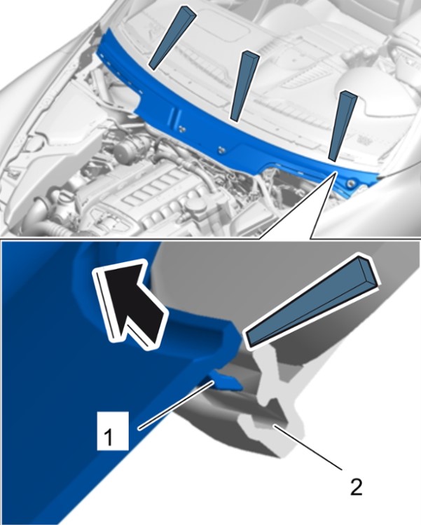 3 Поднять накладку обтекателя -1- сбоку с помощью пластикового клина -стрелка- и отсоединить ее от крепежной планки-2-.