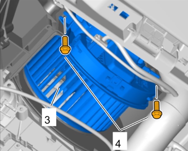 4 Вывернуть два крепежных винта -4- двигателя вентилятора -3-.