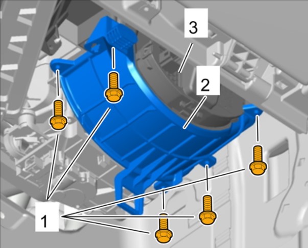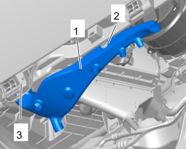 8 Установить дефлектор обдува в пространстве для ног -1- на воздуховод -3- и защелкнуть его в крепление -2-.