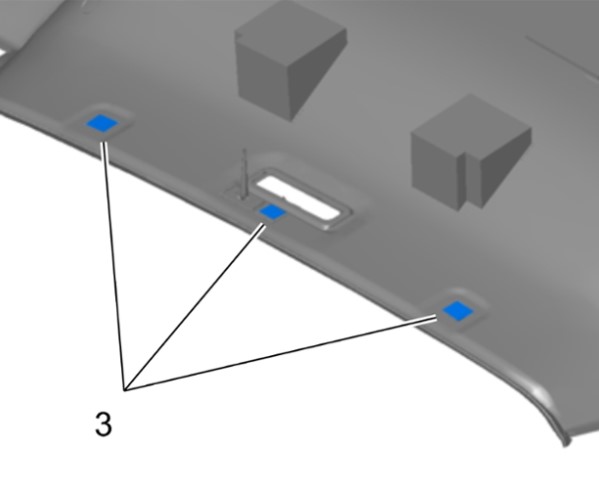 3 Приложить обивку потолка к потолку автомобиля и зафиксировать крепежные зажимы -3- в задней части кузова путем прижатия.