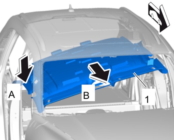 9.2 Вынуть обивку потолка -1- назад через проем задней крышки -B-.