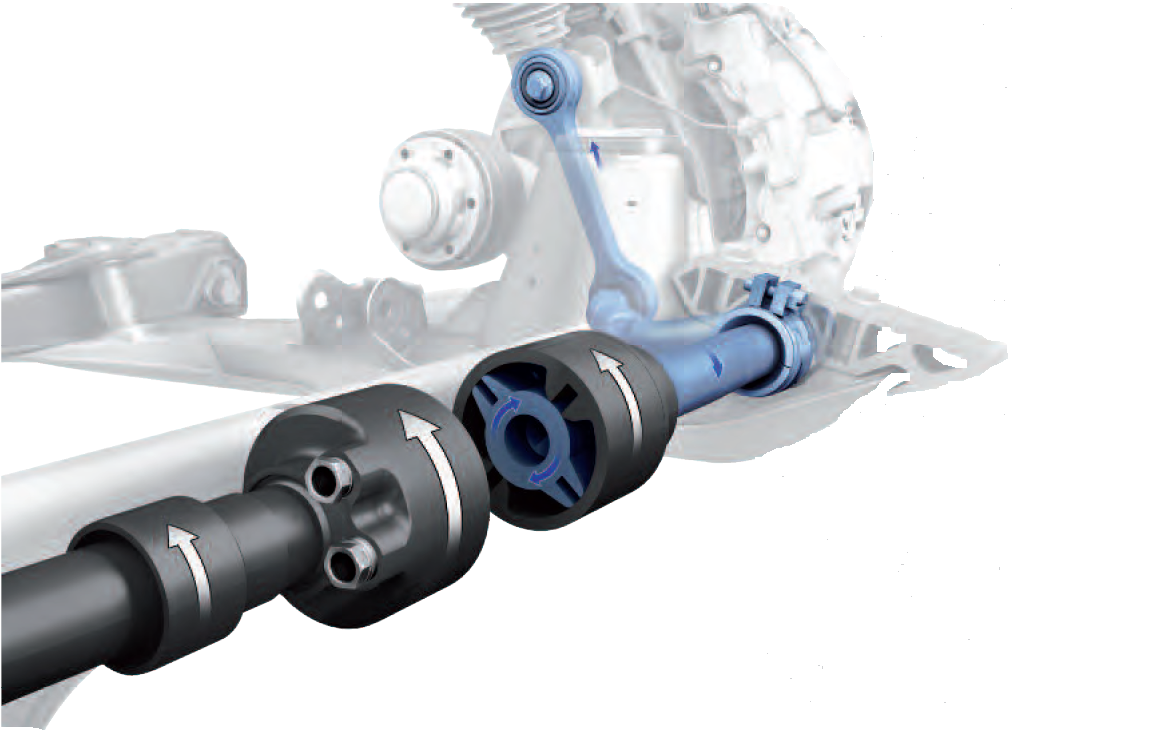 С помощью гидравлических поворотных двигателей активных стабилизаторов передней и задней оси в зависимости от угла поворота рулевого колеса и поперечного ускорения создаются силы, противодействующие поперечному крену кузова. Таким образом, не только комфортная, но и чрезвычайно спортивная езда сочетается с самой высокой маневренностью в любом диапазоне скорости, кроме того, обеспечивается оптимальная управляемость на поворотах и компенсация при изменении нагрузки. С помощью кулисного выключателя на центральной консоли вместе с активацией внедорожного режима 1 можно также перевести PDCC в ориентированный на тягу режим. Обе половины активного стабилизатора теперь могут вращаться еще лучше. Это обеспечивает больший перекос осей. За счет этого колеса дольше соприкасаются с грунтом, и, следовательно, могут передавать большее усилие. Для улучшения тяги на неровной местности.