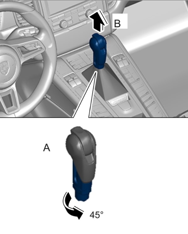 1 Повернуть фиксатор на чехле рычага вниз на 45 градусов в направлении -направление стрелки A- и отсоединить рукоятку селектора движением наверх в направлении -направление стрелки B-.