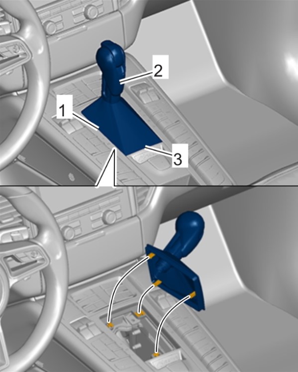 2 Немного вытянуть рукоятку селектора -2- наверх, установить монтажный клин на накладке рукоятки селектора -1- и -3- и осторожно отсоединить ее.