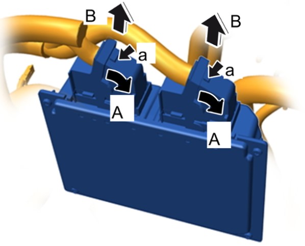 3 Разблокировать -a-, открыть -A- и отсоединить -B- разъем.