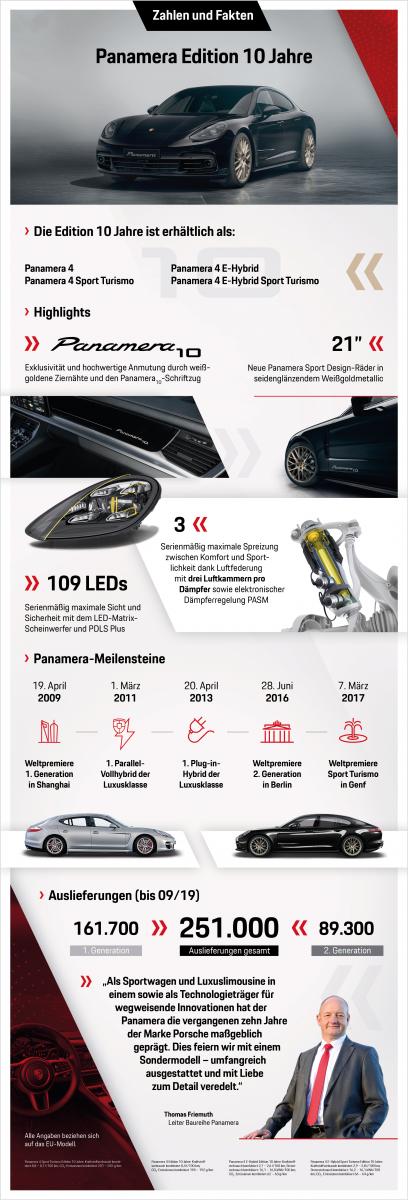 Штутгарт. Компания Porsche отмечает десятилетний юбилей Panamera выпуском специальной модели. Новый Panamera «10 Years Edition» отличается расширенным базовым оснащением в области комфорта и ходовой части, а также дополнительными эксклюзивными акцентами. Новые 21-дюймовые колесные диски Panamera Sport Design цвета White Gold Metallic с блеском и надпись «Panamera10» на передних дверях, также выполненная в цвете White Gold Metallic, предлагаются только для специальных моделей. Кроме того, внутри автомобиля на панели со стороны переднего пассажира и на накладках порогов нанесен юбилейный логотип. Салон имеет частичную кожаную отделку черного цвета, а декоративная строчка цвета White Gold подчеркивает высокое качество. Новое юбилейное исполнение в Германии предлагается для моделей Panamera 4 и Panamera 4 E-Hybrid, а также для их модельных вариантов Sport Turismo с аналогичными двигателями. В России новый юбилейный выпуск предлагается для моделей Panamera, Panamera 4 и Panamera 4 E-Hybrid.