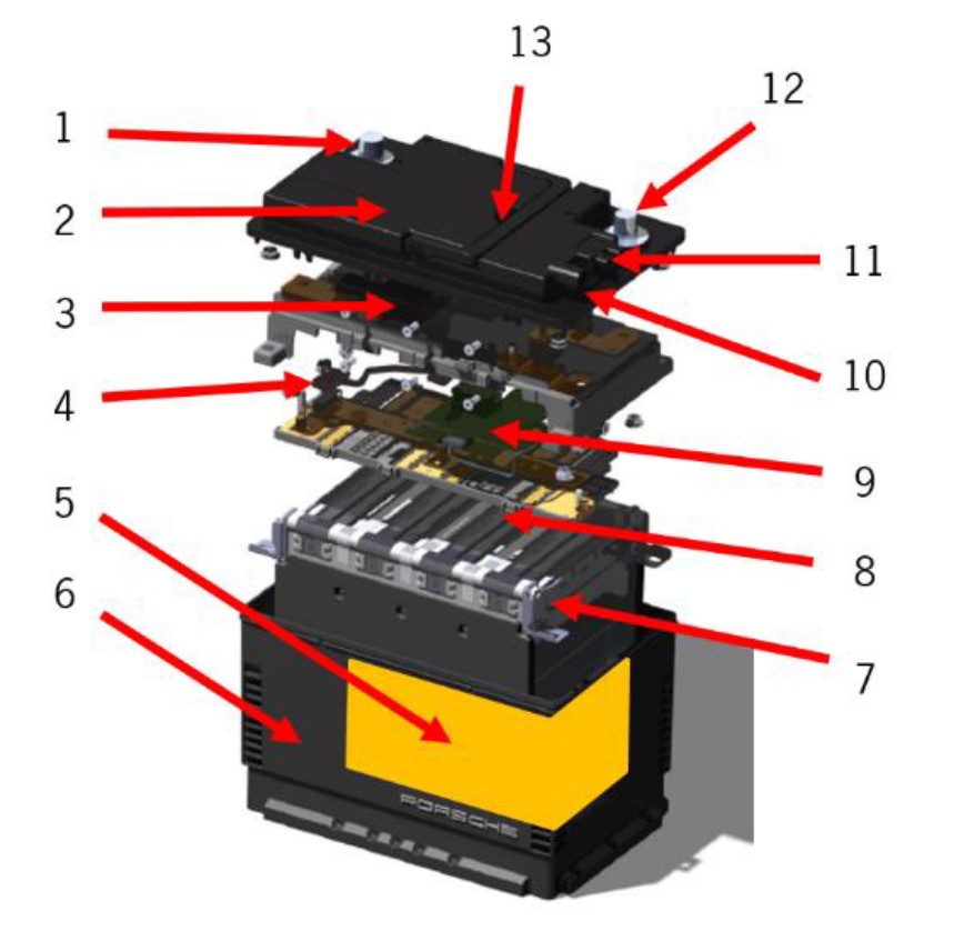 В плане конструкции датчик АКБ (4) теперь располагается внутри АКБ и является ее составной частью. Датчик, который в предыдущих моделях крепился к минусовой клемме с помощью резьбового соединения, отсутствует. Датчик АКБ заменить невозможно. Рядом с минусовой клеммой находисят 1-полюсный соединительный штекер (10 с разъемом LIN, который соединен с блоком управления шлюза. Электропитание датчика АКБ выпоняется на внутреннем уровне с плюсовой (1) и минусовой клеммы (12). На крышке корпуса (2) предусмотрена ручка для переноски (13), в области минусовой клеммы находится рукав линии отвода газа (11). Газоотвод — это устройство защиты, которое отводит возникающие в случае неисправности элементов АКБ (8) ядовитые газы в атмосферу. Последовательно соединенные 4 пленочных элемента (8) из LiFePO4 по соображениям безопасности вставлены в алюминиевый корпус (7). Кроме того, контроллер с ЦП (9) контролирует напряжение элементов, уровень заряда (SOC) и температуру. Если уровень заряда АКБ становится меньше некоторого значения, контроллер с ЦП размыкает контактор (3).