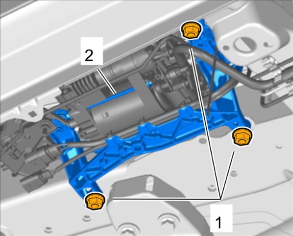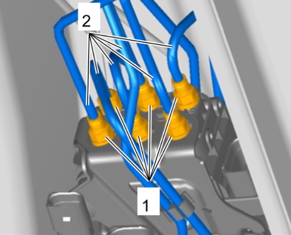 3 Снять пять напорных шлангов -2- с блока клапанов. Синий напорный шланг сверху слева может оставаться в смонтированном состоянии.