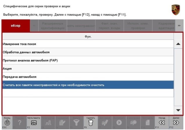 2 Выбрать функцию “Считать и при необходимости очистить память неисправностей всех блоков управления” и подтвердить с помощью клавиши F12 (Далее).