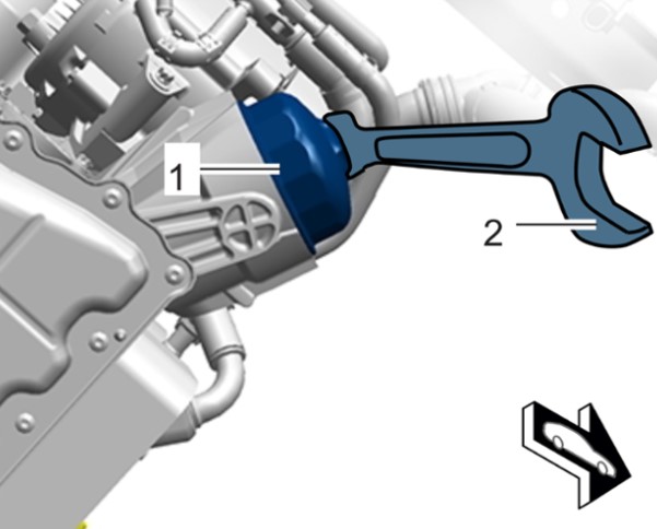 1 Ослабить и вывернуть крышку масляного фильтра -1- с помощью подходящей шестигранной сменной торцовой головки или накидного ключа -2-.
