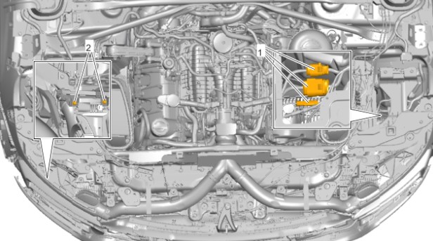 12 Разблокировать и отсоединить электрические штекерные соединения -1- жгута проводов спереди, отсоединить жгут проводов от кузова.