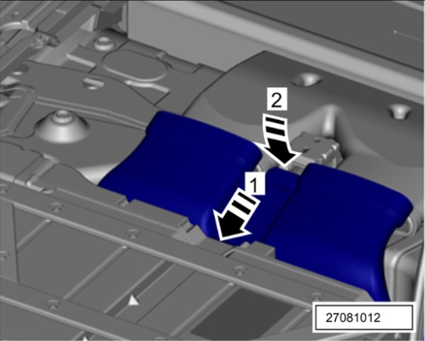 9 Вставить оба электрических разъема -1, 2- для системы управления АКБ до ощутимой фиксации разъемов.