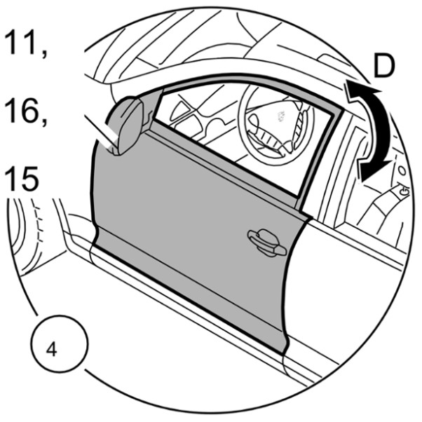 Положение рамы окна (крепежная рама двери) относительно рамы крыши и стойки В должно быть отрегулировано (-стрелка D-). Точками вращения являются опорные вилки -14-, -15- и направляющие пальцы -13-, -16-. Отрегулировать зазоры крепежной рамы двери.