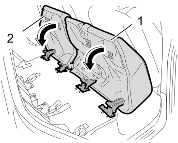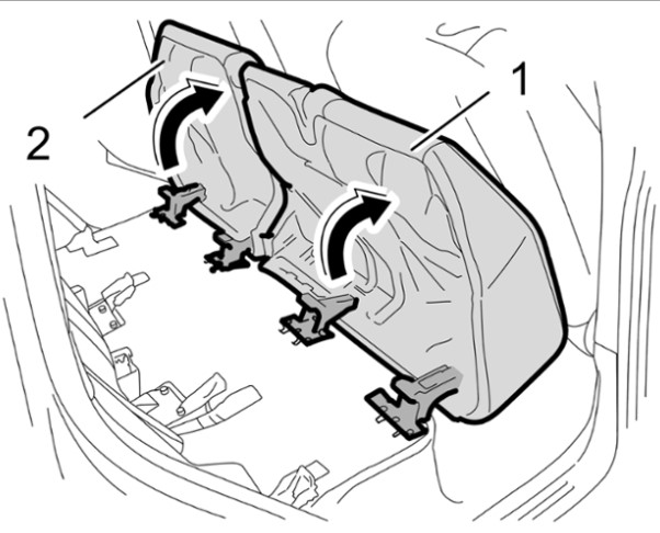 1 Освободить из фиксаторов задние сиденья -1, 2- откинуть их вверх на 90° -стрелки-.