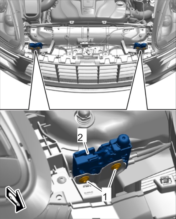 2 Проверить, правильно ли закреплена тяга замка передней крышки -2- в замке передней крышки слева и справа -стрелка A-: