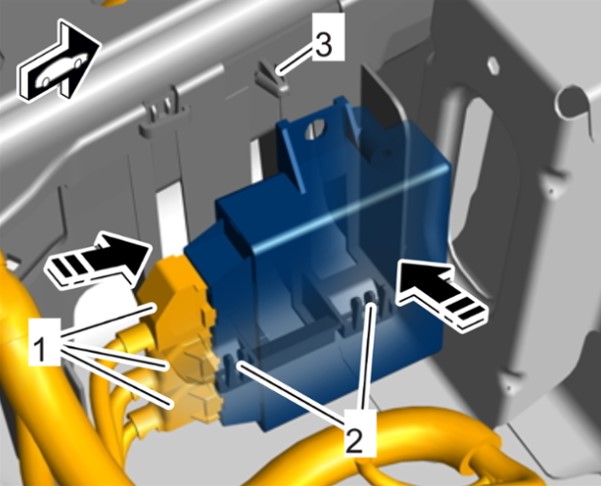 1 Вставить блок управления парковочного ассистента в держатель -2- и прижать блок управления к зажиму -3- до ощутимой фиксации зажима.