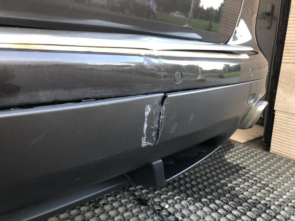 Погнута еще алюминиевая накладка под дверью багажника, а под ней вертикальная трещина на обеих этих деталях, выглядит, как будто топориком долбанули.