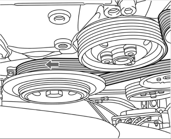 4 Пометить мелом направление вращения приводного ремня и снять приводной ремень с демпфера крутильных колебаний.
