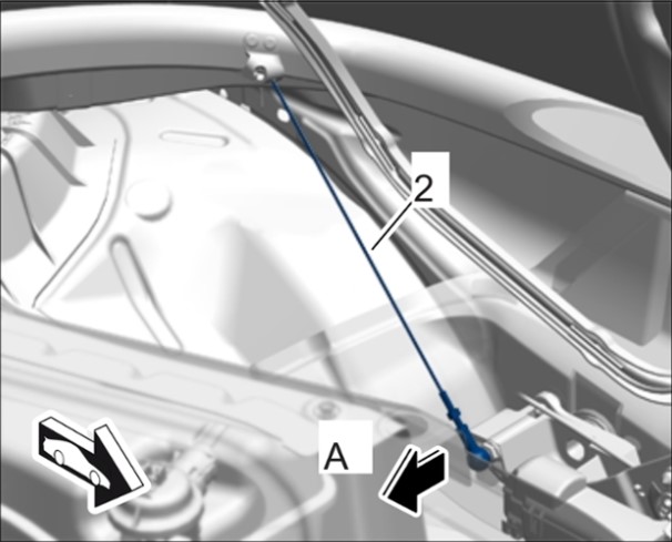 3 Отсоединить натяжные тросы -2- слева и справа через отверстие дуги безопасности от направляющих -стрелка A-.