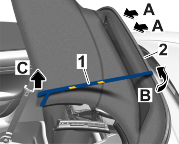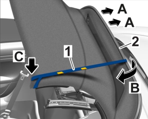 7 Протянуть крепежную ленту -1- слева и справа над тентом складного верха к левой закраине складного верха -стрелка B- и зафиксировать ее -стрелка C-.