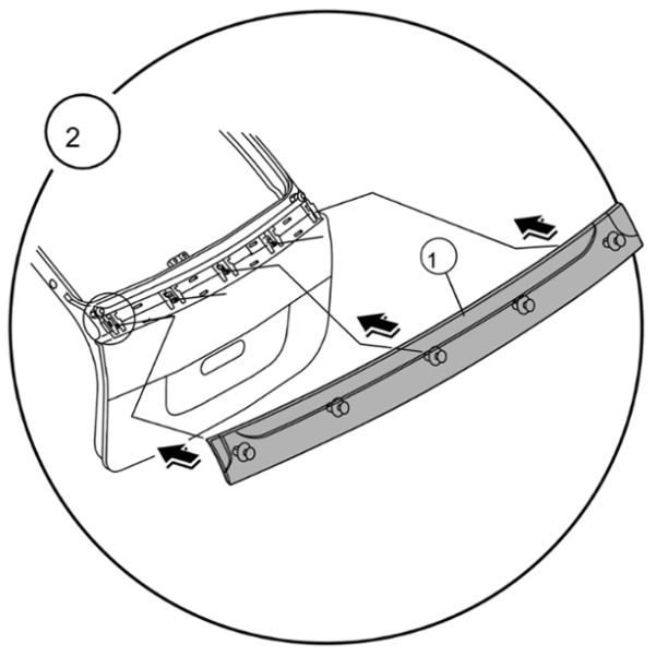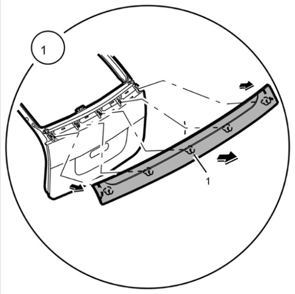 Осторожно вытянуть облицовку -1- из держателя. При необходимости вставить пластиковый клин между задним окном и облицовкой и извлечь облицовку.