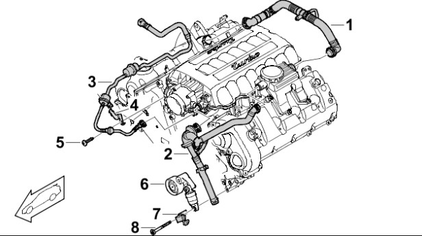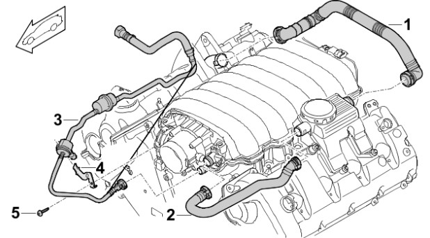 1 Отсоединить трубопровод вентиляции двигателя на клапанной крышке стороны цилиндров с 1 по 4. Атмосферный двигатель -1- или Turbo -1-