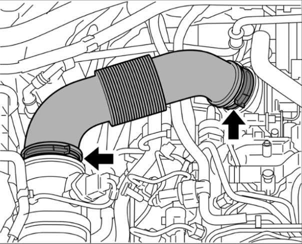 4 Снять шланг воздуховода справа -стрелка- на турбонагнетателе.