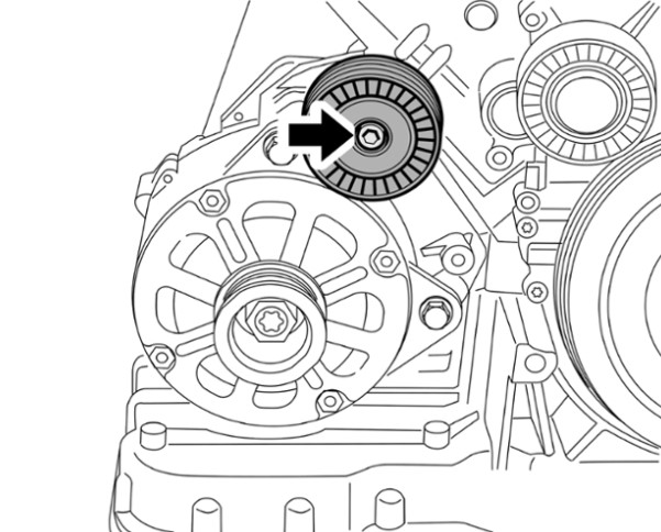9 Вывернуть крепежный винт -стрелка- и снять направляющий ролик.