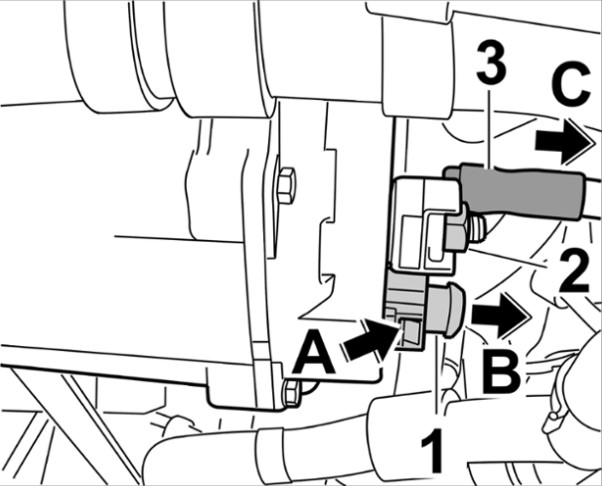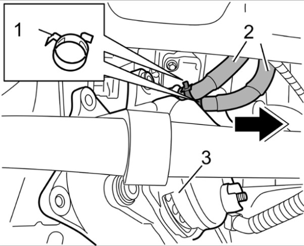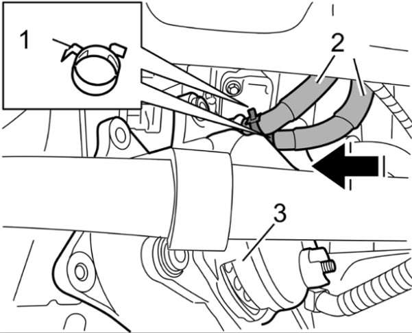 4.2 Сжать пружинные хомуты -1- и снять подающий и обратный шланг -2- со штуцеров охлаждения на трехфазном генераторе -3-.