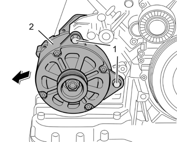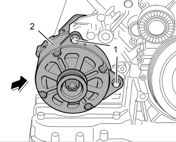 3 Вывернуть крепежные винты -1- и отложить трехфазный генератор -2- в сторону -стрелка-. При необходимости выдавить трехфазный генератор из крепления рычагом