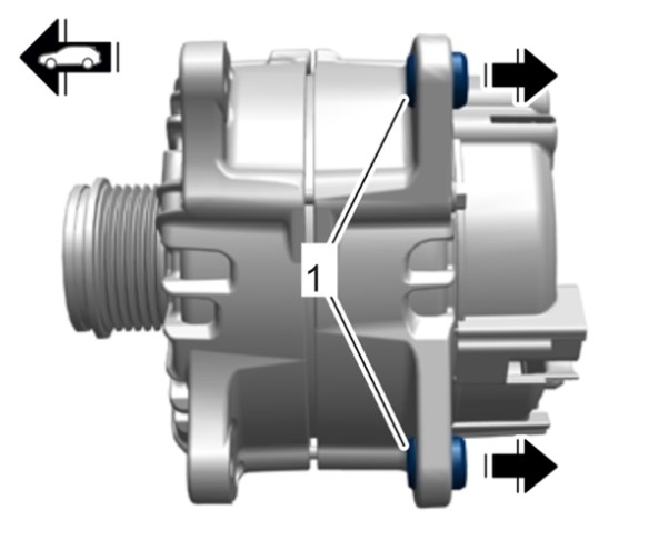 3 Расположить трехфазный генератор -2- в монтажном положении -стрелка- и привернуть крепежными винтами -1-. Момент затяжки 22 Nm