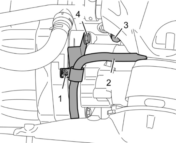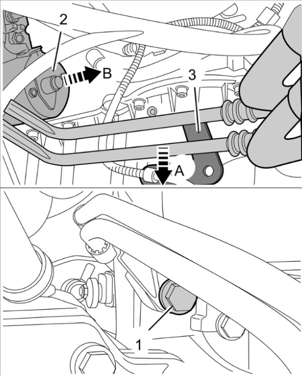 5 Отвернуть крепежную гайку -3- и снять провод B+ с болта с резьбой -стрелка C-.