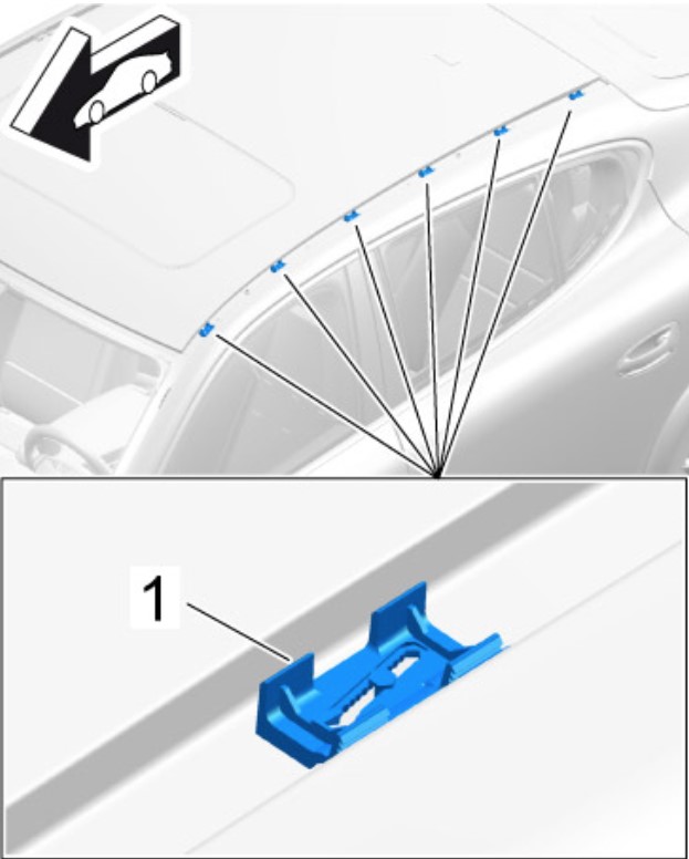 1 Проверить крепежные зажимы -1- на автомобиле и на рейке крыши на повреждение