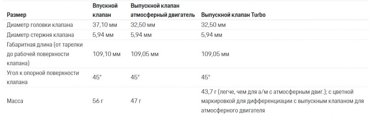 В автомобиле Turbo у выпускного клапана есть внутренняя и внешняя пружины и подогнанная тарелка пружины (отличается от приведенного ниже изображения). Выпускной клапан модели Turbo имеет такие же размеры, как у атмосферного двигателя, но, благодаря натриевому наполнителю, он легче по весу и при поставке в качестве запчастей отмечен цветной точкой. Подробности см. в следующей главе под заголовком "Размеры клапанов".