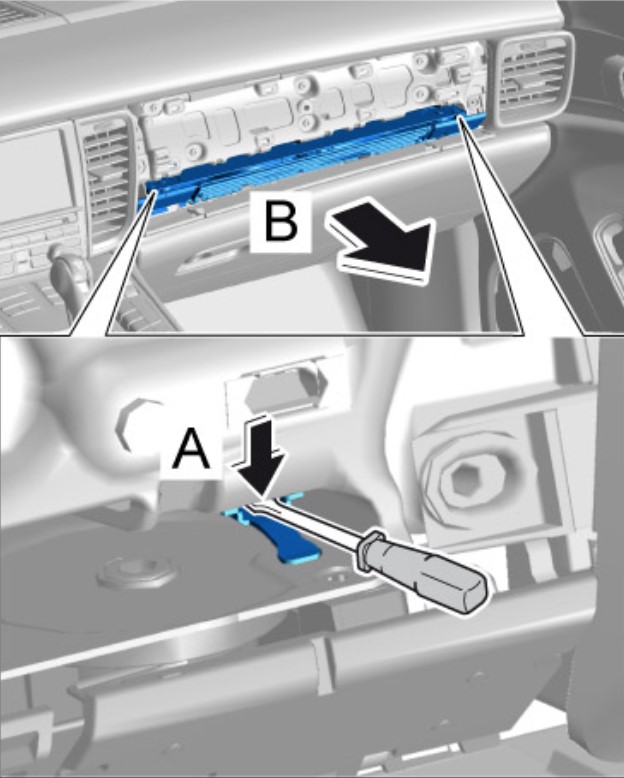 3 Потянуть подстаканник из направляющей в направлении салона автомобиля -стрелка B-.