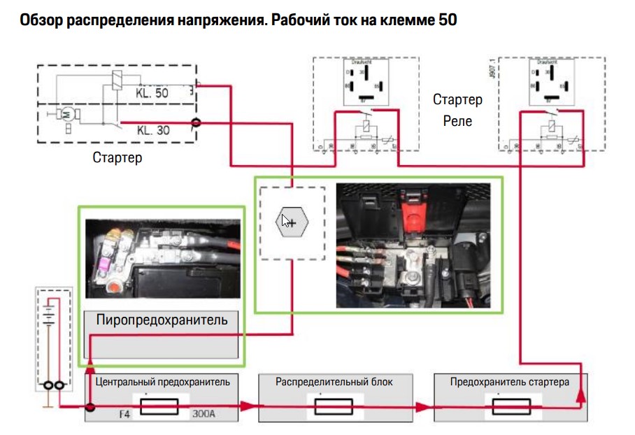 С плюсовой клеммы (A) 2 провода (B+C) через приваренные плавкие предохранители 150 A и 200 A подключены к бортовой сети для электропитания салона автомобиля (блок предохранителей/реле в опоре для ног слева) и в багажном отсеке (блок предохранителей в задней части). Пиропредохранитель (D) в случае столкновения активируется блоком управления подушки безопасности «по фиксированной проводке» и отсоединяет выход от точки подключения внешнего источника питания (Н) на генераторе и стартере.