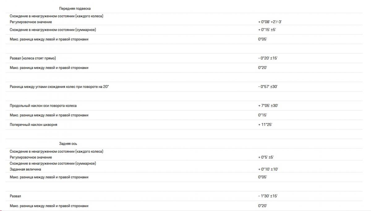 При необходимости проведения РУУК на а/м с пробегом менее 200 км, например, при ремонте после аварии, при регулировке схождения колес необходимо руководствоваться регулировочными значениями. Углы установки колес регулируются по верхним границам допусков для задней и передней осей.